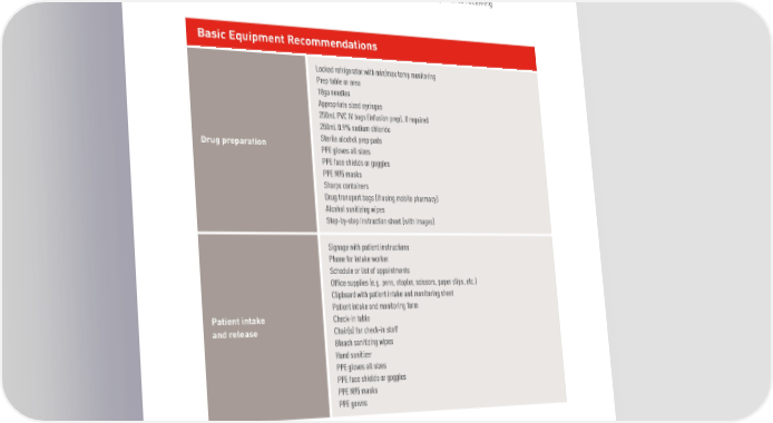 BASIC EQUIPMENT RECOMMENDATIONS Equipment requirements may vary by state. Follow your local requirements when determining the equipment needed for your infusion center. Based on Lilly’s clinical trial experience, the following equipment should be considered to ensure the safest care environment for patients receiving bamlanivimab antibody infusion. Basic Equipment Recommendations Locked refrigerator with min/max temp monitoring Prep table or area 18ga needles Appropriate sized syringes 250mL PVC IV bags (infusion prep), if required 250mL 0.9% sodium chloride Drug preparation Sterile alcohol prep pads PPE gloves all sizes PPE face shields or goggles PPE N95 masks Sharps containers Drug transport bags (if using mobile pharmacy) Alcohol sanitizing wipes Step-by-step instruction sheet (with images) Signage with patient instructions Phone for intake worker Schedule or list of appointments Office supplies (e.g. pens, stapler, scissors, paper clips, etc.) Clipboard with patient intake and monitoring sheet Patient intake and monitoring form Patient intake Check-in table and release Chair(s) for check-in staff Bleach sanitizing wipes Hand sanitizer PPE gloves all sizes PPE face shields or goggles PPE N95 masks PPE gowns Lilly Bamlanivimab Antibody Playbook | 30 PP-BM-US-0024