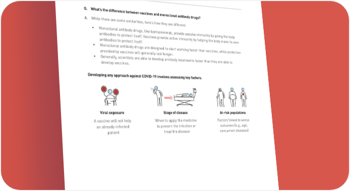 EDUCATION AND AWARENESS Attacking the coronavirus will require a diverse set of approaches, including both vaccines and treatments, such as antibodies. Q. What’s the difference between vaccines and monoclonal antibody drugs? A. While there are some similarities, here’s how they are different: • Monoclonal antibody drugs, like bamlanivimab, provide passive immunity by giving the body antibodies to protect itself. Vaccines provide active immunity by helping the body make its own antibodies to protect itself. • Monoclonal antibody drugs are designed to start working faster than vaccines, while protection provided by vaccines will generally last longer. • Generally, scientists are able to develop antibody treatments faster than they are able to develop vaccines. Developing any approach against COVID-19 involves assessing key factors: Viral exposure Stage of disease At-risk populations A vaccine will not help When to apply the medicine Factors linked to worse an already-infected to prevent the infection or outcomes (e.g., age, patient treat the disease concurrent diseases) Lilly Bamlanivimab Antibody Playbook | 24 PP-BM-US-0024
