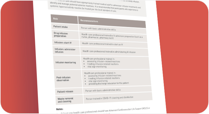 STAFFING RECOMMENDATIONS Staffing requirements may vary by state. Follow your local requirements when determining the staff needed for your infusion site of care. Based on Lilly’s clinical trial experience, the following roles should be considered to ensure the safest care environment for patients receiving bamlanivimab antibody infusion. Infusion sites of care should have appropriately trained medical staff to administer infusion treatments and identify and manage potential adverse reactions. It is recommended that participants who experience a systemic hypersensitivity reaction be treated per the local standard of care. Role Recommendations Patient intake Person with basic administrative skills Drug infusion Health care professional trained in IV admixture preparation (such as a preparation nurse, pharmacist, pharmacy tech) Infusion: start IV Health care professional trained to start an IV Infusion: administer Health care professional trained in administering IV infusion infusion Healthcare professional trained in: Infusion monitoring • assessing infusion-related reactions • treating infusion-related reactions • vital sign monitoring Healthcare professional trained in: Post-infusion • assessing infusion-related reactions observation • treating infusion-related reactions • vital sign monitoring • providing discharge education for the patient Patient release Person with basic administrative skills Waste removal Person trained in COVID-19 cleaning and disinfection and cleaning Notes: • At least one health care professional should have Advanced Cardiovascular Life Support (ACLS) or Basic Life Support (BLS) certification or equivalent. • The same health care professional may perform more than one role. • State or county requirements may dictate specific qualifications for some roles. Lilly Bamlanivimab Antibody Playbook | 21 PP-BM-US-0024