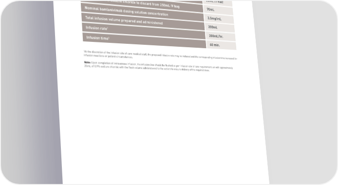 Preparation Summary Table for 700mg Dose of Bamlanivimab Solution for Intravenous Infusion Bamlanivimab dose 700mg Volume of bamlanivimab drug product (and # of vials) needed 20mL (1 vial) Volume of 0.9% sodium chloride to discard from 250mL IV bag 70mL Nominal bamlanivimab dosing solution concentration 3.5mg/mL Total infusion volume prepared and administered 200mL Infusion rate1 200mL/hr. 1 Infusion time 60 min. 1 At the discretion of the infusion site of care medical staff, the proposed infusion rate may be reduced and the corresponding infusion time increased for infusion reactions or patient circumstances. Note: Upon completion of intravenous infusion, the infusion line should be flushed as per infusion site of care requirements or with approximately 25mL of 0.9% sodium chloride with the flush volume administered to the patient to ensure delivery of the required dose. Lilly Bamlanivimab Antibody Playbook | 19 PP-BM-US-0024