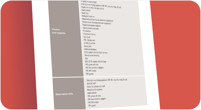 Basic Equipment Recommendations Chairs for infusion Chairside table IV poles IV pump (or gravity feed) Vital signs monitoring equipment (BP, HR, resp rate, temp, 02 sat) Supply cart or other storage cabinet Hand sanitizer Hand soap Biohazard trash can Bleach wipes (cleaning non-electronic equipment) Alcohol wipes (cleaning electronic equipment) Medical emergency supplies Sterile alcohol prep pads Infusion IV catheters area supplies IV extension tubing Tourniquet PVC infusion sets 0.20/0.22µm filter Gauze pads Adhesive bandages 0.9% sodium chloride flush syringes Bio-occlusive dressing Tape 50mL 0.9% sodium chloride bags PPE-gloves all sizes PPE-face shields or goggles PPE-N95 masks PPE-gowns Vital signs monitoring equipment (BP, HR, resp rate, temp, 02 sat) Table for staff Chairs for patients and staff Bleach sanitizing wipes Observation area Hand sanitizer PPE-gloves all sizes PPE-face shields or goggles PPE-N95 masks PPE-gowns Lilly Bamlanivimab Antibody Playbook | 31 PP-BM-US-0024