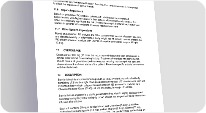11.4 Geriatric Use Of the 309 patients receiving bamlanivimab in BLAZE-1, 11% were 65 years of age and older and 3% were 75 years of age and older. Based on population PK analyses, there is no difference in PK in geriatric patients compared to younger patients. 11.5 Renal Impairment Bamlanivimab is not eliminated intact in the urine, thus renal impairment is not expected to affect the exposure of bamlanivimab. 11.6 Hepatic Impairment Based on population PK analysis, patients with mild hepatic impairment had approximately 20% higher clearance than patients with normal hepatic function. This effect is statistically significant, but not clinically meaningful. Bamlanivimab has not been studied in patients with moderate or severe hepatic impairment. 11.7 Other Specific Populations Based on population PK analysis, the PK of bamlanivimab was not affected by sex, race, and disease severity or inflammation. Body weight had no clinically relevant effect on the PK of bamlanivimab in adults with COVID-19 over the body weight range of 41 kg to 173 kg. 12 OVERDOSAGE Doses up to 7,000 mg (10 times the recommended dose) have been administered in clinical trials without dose-limiting toxicity. Treatment of overdose with bamlanivimab should consist of general supportive measures including monitoring of vital signs and observation of the clinical status of the patient. There is no specific antidote for overdose with bamlanivimab. 13 DESCRIPTION Bamlanivimab is a human immunoglobulin G-1 (IgG1 variant) monoclonal antibody consisting of 2 identical light chain polypeptides composed of 214 amino acids each and 2 identical heavy chain polypeptides composed of 455 amino acids produced by a Chinese Hamster Ovary (CHO) cell line and molecular weight of 146 kDa. Bamlanivimab injection is a sterile, preservativeāfree, clear to slightly opalescent and colorless to slightly yellow to slightly brown solution in a single-dose vial for intravenous infusion after dilution. Each mL contains 35 mg of bamlanivimab, and L-histidine (0.4 mg), L-histidine hydrochloride monohydrate (0.6 mg), sodium chloride (2.9 mg), sucrose (60 mg), polysorbate 80 (0.5 mg), and Water for Injection. The bamlanivimab solution has a pH range of 5.5-6.5. 17