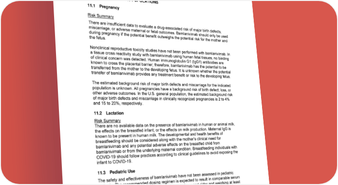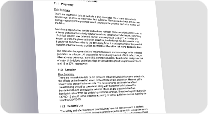 10 DRUG INTERACTIONS Bamlanivimab is not renally excreted or metabolized by cytochrome P450 enzymes; therefore, interactions with concomitant medications that are renally excreted or that are substrates, inducers, or inhibitors of cytochrome P450 enzymes are unlikely. 11 USE IN SPECIFIC POPULATIONS 11.1 Pregnancy Risk Summary There are insufficient data to evaluate a drug-associated risk of major birth defects, miscarriage, or adverse maternal or fetal outcomes. Bamlanivimab should only be used during pregnancy if the potential benefit outweighs the potential risk for the mother and the fetus. Nonclinical reproductive toxicity studies have not been performed with bamlanivimab. In a tissue cross reactivity study with bamlanivimab using human fetal tissues, no binding of clinical concern was detected. Human immunoglobulin G1 (IgG1) antibodies are known to cross the placental barrier; therefore, bamlanivimab has the potential to be transferred from the mother to the developing fetus. It is unknown whether the potential transfer of bamlanivimab provides any treatment benefit or risk to the developing fetus. The estimated background risk of major birth defects and miscarriage for the indicated population is unknown. All pregnancies have a background risk of birth defect, loss, or other adverse outcomes. In the U.S. general population, the estimated background risk of major birth defects and miscarriage in clinically recognized pregnancies is 2 to 4% and 15 to 20%, respectively. 11.2 Lactation Risk Summary There are no available data on the presence of bamlanivimab in human or animal milk, the effects on the breastfed infant, or the effects on milk production. Maternal IgG is known to be present in human milk. The developmental and health benefits of breastfeeding should be considered along with the mother’s clinical need for bamlanivimab and any potential adverse effects on the breastfed child from bamlanivimab or from the underlying maternal condition. Breastfeeding individuals with COVID-19 should follow practices according to clinical guidelines to avoid exposing the infant to COVID-19. 11.3 Pediatric Use The safety and effectiveness of bamlanivimab have not been assessed in pediatric patients. The recommended dosing regimen is expected to result in comparable serum exposures of bamlanivimab in patients 12 years of age and older and weighing at least 40 kg as observed in adults, based on a pharmacokinetic (PK) modeling approach which accounted for effect of body weight changes associated with age on clearance and volume of distribution. 16