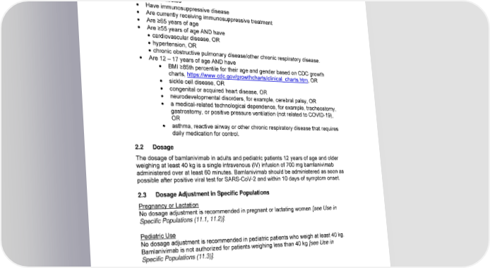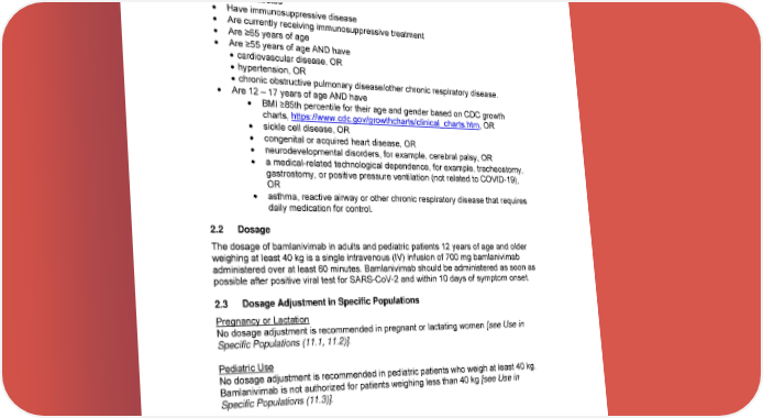 years of age and older weighing at least 40 kg who are at high risk for progressing to severe COVID-19 and/or hospitalization. High risk is defined as patients who meet at least one of the following criteria: Have a body mass index (BMI) ≥35 Have chronic kidney disease Have diabetes Have immunosuppressive disease Are currently receiving immunosuppressive treatment Are ≥65 years of age Are ≥55 years of age AND have cardiovascular disease, OR hypertension, OR chronic obstructive pulmonary disease/other chronic respiratory disease. Are 12 – 17 years of age AND have BMI ≥85th percentile for their age and gender based on CDC growth charts, https://www.cdc.gov/growthcharts/clinical_charts.htm, OR sickle cell disease, OR congenital or acquired heart disease, OR neurodevelopmental disorders, for example, cerebral palsy, OR a medical-related technological dependence, for example, tracheostomy, gastrostomy, or positive pressure ventilation (not related to COVID-19), OR asthma, reactive airway or other chronic respiratory disease that requires daily medication for control. 2.2 Dosage The dosage of bamlanivimab in adults and pediatric patients 12 years of age and older weighing at least 40 kg is a single intravenous (IV) infusion of 700 mg bamlanivimab administered over at least 60 minutes. Bamlanivimab should be administered as soon as possible after positive viral test for SARS-CoV-2 and within 10 days of symptom onset. 2.3 Dosage Adjustment in Specific Populations Pregnancy or Lactation No dosage adjustment is recommended in pregnant or lactating women [see Use in Specific Populations (11.1, 11.2)]. Pediatric Use No dosage adjustment is recommended in pediatric patients who weigh at least 40 kg. Bamlanivimab is not authorized for patients weighing less than 40 kg [see Use in Specific Populations (11.3)]. Geriatric Use No dosage adjustment is recommended in geriatric patients [see Use in Specific Populations (11.4)]. 10