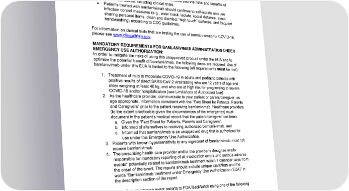 least 40 kg, and who are at high risk for progressing to severe COVID-19 and/or hospitalization [see Limitations of Authorized Use]. The patient or parent/caregiver has the option to accept or refuse bamlanivimab. The significant known and potential risks and benefits of bamlanivimab, and the extent to which such potential risks and benefits are unknown. Information on available alternative treatments and the risks and benefits of those alternatives, including clinical trials. Patients treated with bamlanivimab should continue to self-isolate and use infection control measures (e.g., wear mask, isolate, social distance, avoid sharing personal items, clean and disinfect “high touch” surfaces, and frequent handwashing) according to CDC guidelines. For information on clinical trials that are testing the use of bamlanivimab for COVID-19, please see www.clinicaltrials.gov. MANDATORY REQUIREMENTS FOR BAMLANIVIMAB ADMINISTRATION UNDER EMERGENCY USE AUTHORIZATION: In order to mitigate the risks of using this unapproved product under the EUA and to optimize the potential benefit of bamlanivimab, the following items are required. Use of bamlanivimab under this EUA is limited to the following (all requirements must be met): 1. Treatment of mild to moderate COVID-19 in adults and pediatric patients with positive results of direct SARS-CoV-2 viral testing who are 12 years of age and older weighing at least 40 kg, and who are at high risk for progressing to severe COVID-19 and/or hospitalization [see Limitations of Authorized Use]. 2. As the healthcare provider, communicate to your patient or parent/caregiver, as age appropriate, information consistent with the “Fact Sheet for Patients, Parents and Caregivers” prior to the patient receiving bamlanivimab. Healthcare providers (to the extent practicable given the circumstances of the emergency) must document in the patient’s medical record that the patient/caregiver has been: a. Given the “Fact Sheet for Patients, Parents and Caregivers”, b. Informed of alternatives to receiving authorized bamlanivimab, and c. Informed that bamlanivimab is an unapproved drug that is authorized for use under this Emergency Use Authorization. 3. Patients with known hypersensitivity to any ingredient of bamlanivimab must not receive bamlanivimab. 4. The prescribing health care provider and/or the provider’s designee are/is responsible for mandatory reporting of all medication errors and serious adverse events* potentially related to bamlanivimab treatment within 7 calendar days from the onset of the event. The reports should include unique identifiers and the words “Bamlanivimab treatment under Emergency Use Authorization (EUA)” in the description section of the report. Submit adverse event reports to FDA MedWatch using one of the following methods: Complete and submit the report online: www.fda.gov/medwatch/report.htm, or 6
