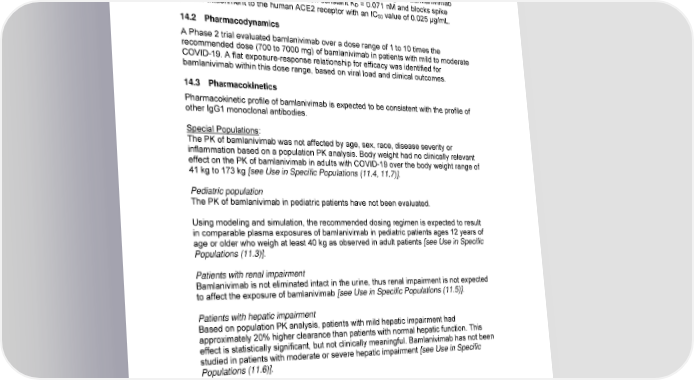 14 CLINICAL PHARMACOLOGY 14.1 Mechanism of Action Bamlanivimab is a recombinant neutralizing human IgG1κ monoclonal antibody (mAb) to the spike protein of SARS-CoV-2, and is unmodified in the Fc region. Bamlanivimab binds to spike protein with a dissociation constant KD = 0.071 nM and blocks spike protein attachment to the human ACE2 receptor with an IC value of 0.025 µg/mL. 50 14.2 Pharmacodynamics A Phase 2 trial evaluated bamlanivimab over a dose range of 1 to 10 times the recommended dose (700 to 7000 mg) of bamlanivimab in patients with mild to moderate COVID-19. A flat exposure-response relationship for efficacy was identified for bamlanivimab within this dose range, based on viral load and clinical outcomes. 14.3 Pharmacokinetics Pharmacokinetic profile of bamlanivimab is expected to be consistent with the profile of other IgG1 monoclonal antibodies. Special Populations: The PK of bamlanivimab was not affected by age, sex, race, disease severity or inflammation based on a population PK analysis. Body weight had no clinically relevant effect on the PK of bamlanivimab in adults with COVID-19 over the body weight range of 41 kg to 173 kg [see Use in Specific Populations (11.4, 11.7)]. Pediatric population The PK of bamlanivimab in pediatric patients have not been evaluated. Using modeling and simulation, the recommended dosing regimen is expected to result in comparable plasma exposures of bamlanivimab in pediatric patients ages 12 years of age or older who weigh at least 40 kg as observed in adult patients [see Use in Specific Populations (11.3)]. Patients with renal impairment Bamlanivimab is not eliminated intact in the urine, thus renal impairment is not expected to affect the exposure of bamlanivimab [see Use in Specific Populations (11.5)]. Patients with hepatic impairment Based on population PK analysis, patients with mild hepatic impairment had approximately 20% higher clearance than patients with normal hepatic function. This effect is statistically significant, but not clinically meaningful. Bamlanivimab has not been studied in patients with moderate or severe hepatic impairment [see Use in Specific Populations (11.6)]. Drug interactions: Bamlanivimab is not renally excreted or metabolized by cytochrome P450 enzymes; therefore, interactions with concomitant medications that are renally excreted or that are substrates, inducers, or inhibitors of cytochrome P450 enzymes are unlikely [see Drug Interactions (10)]. 18