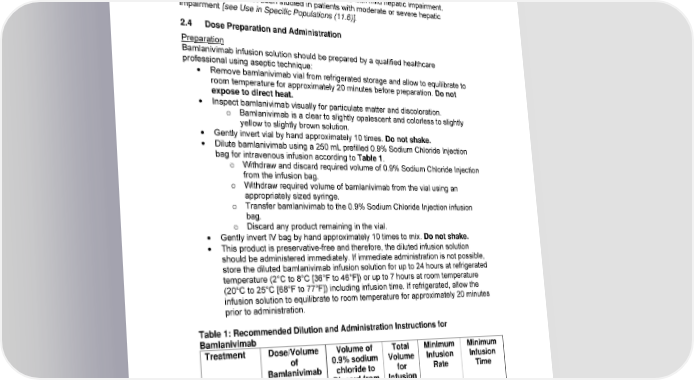 Renal Impairment No dosage adjustment is recommended in patients with renal impairment [see Use in Specific Populations (11.5)]. Hepatic Impairment No dosage adjustment is recommended in patients with mild hepatic impairment. Bamlanivimab has not been studied in patients with moderate or severe hepatic impairment [see Use in Specific Populations (11.6)]. 2.4 Dose Preparation and Administration Preparation Bamlanivimab infusion solution should be prepared by a qualified healthcare professional using aseptic technique: Remove bamlanivimab vial from refrigerated storage and allow to equilibrate to room temperature for approximately 20 minutes before preparation. Do not expose to direct heat. Inspect bamlanivimab visually for particulate matter and discoloration. o Bamlanivimab is a clear to slightly opalescent and colorless to slightly yellow to slightly brown solution. Gently invert vial by hand approximately 10 times. Do not shake. Dilute bamlanivimab using a 250 mL prefilled 0.9% Sodium Chloride Injection bag for intravenous infusion according to Table 1. o Withdraw and discard required volume of 0.9% Sodium Chloride Injection from the infusion bag. o Withdraw required volume of bamlanivimab from the vial using an appropriately sized syringe. o Transfer bamlanivimab to the 0.9% Sodium Chloride Injection infusion bag. o Discard any product remaining in the vial. Gently invert IV bag by hand approximately 10 times to mix. Do not shake. This product is preservative-free and therefore, the diluted infusion solution should be administered immediately. If immediate administration is not possible, store the diluted bamlanivimab infusion solution for up to 24 hours at refrigerated temperature (2°C to 8°C [36°F to 46°F]) or up to 7 hours at room temperature (20°C to 25°C [68°F to 77°F]) including infusion time. If refrigerated, allow the infusion solution to equilibrate to room temperature for approximately 20 minutes prior to administration. Table 1: Recommended Dilution and Administration Instructions for Bamlanivimab Treatment Dose/Volume Volume of Total Minimum Minimum of 0.9% sodium Volume Infusion Infusion Bamlanivimab chloride to for Rate Time (# of vials) Discard from Infusion a 250 mL IV bag Bamlanivimab 700 mg/20 mL 70 mL 200 mL 200 mL/hr 60 minutes (1 vial) 11