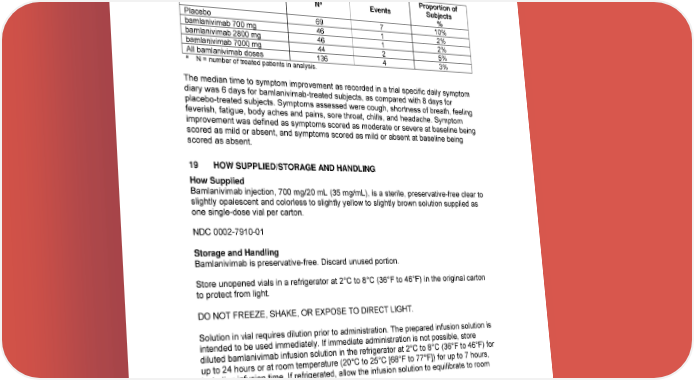 The absolute risk reduction for bamlanivimab compared to placebo is greater in subjects at higher risk of hospitalization according to the high risk criteria (Table 4). Table 4: Proportion of Subjects with Events of Hospitalization or Emergency Room Visits for Subjects at Higher Risk of Hospitalization Proportion of a Treatment N Events Subjects % Placebo 69 7 10% bamlanivimab 700 mg 46 1 2% bamlanivimab 2800 mg 46 1 2% bamlanivimab 7000 mg 44 2 5% All bamlanivimab doses 136 4 3% a N = number of treated patients in analysis. The median time to symptom improvement as recorded in a trial specific daily symptom diary was 6 days for bamlanivimab-treated subjects, as compared with 8 days for placebo-treated subjects. Symptoms assessed were cough, shortness of breath, feeling feverish, fatigue, body aches and pains, sore throat, chills, and headache. Symptom improvement was defined as symptoms scored as moderate or severe at baseline being scored as mild or absent, and symptoms scored as mild or absent at baseline being scored as absent. 19 HOW SUPPLIED/STORAGE AND HANDLING How Supplied Bamlanivimab injection, 700 mg/20 mL (35 mg/mL), is a sterile, preservative-free clear to slightly opalescent and colorless to slightly yellow to slightly brown solution supplied as one single-dose vial per carton. NDC 0002-7910-01 Storage and Handling Bamlanivimab is preservative-free. Discard unused portion. Store unopened vials in a refrigerator at 2°C to 8°C (36°F to 46°F) in the original carton to protect from light. DO NOT FREEZE, SHAKE, OR EXPOSE TO DIRECT LIGHT. Solution in vial requires dilution prior to administration. The prepared infusion solution is intended to be used immediately. If immediate administration is not possible, store diluted bamlanivimab infusion solution in the refrigerator at 2°C to 8°C (36°F to 46°F) for up to 24 hours or at room temperature (20°C to 25°C [68°F to 77°F]) for up to 7 hours, including infusion time. If refrigerated, allow the infusion solution to equilibrate to room temperature prior to administration. 20 PATIENT COUNSELING INFORMATION Patients treated with bamlanivimab should continue to self-isolate and use infection control measures (e.g., wear mask, isolate, social distance, avoid sharing personal 22