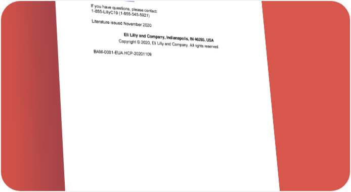 items, clean and disinfect “high touch” surfaces, and frequent handwashing) according to CDC guidelines. Also see Fact Sheet for Patients, Parents and Caregivers. 21 CONTACT INFORMATION For additional information visit: www.bamlanivimab.com If you have questions, please contact: 1-855-LillyC19 (1-855-545-5921) Literature issued November 2020 Eli Lilly and Company, Indianapolis, IN 46285, USA Copyright © 2020, Eli Lilly and Company. All rights reserved. BAM-0001-EUA HCP-20201109 23