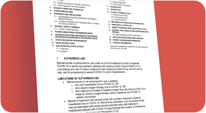 FULL EUA PRESCRIBING INFORMATION FULL EUA PRESCRIBING INFORMATION: CONTENTS* 11.3 Pediatric Use 1 AUTHORIZED USE 11.4 Geriatric Use 2 DOSAGE AND ADMINISTRATION 11.5 Renal Impairment 2.1 Patient Selection 11.6 Hepatic Impairment 2.2 Dosage 11.7 Other Specific Populations 2.3 Dosage Adjustment in Specific Populations 12 OVERDOSAGE 2.4 Dose Preparation and Administration 13 DESCRIPTION 3 DOSAGE FORMS AND STRENGTHS 14 CLINICAL PHARMACOLOGY 4 CONTRAINDICATIONS 14.1 Mechanism of Action 5 WARNINGS AND PRECAUTIONS 14.2 Pharmacodynamics 5.1 Hypersensitivity Including Anaphylaxis and Infusion- 14.3 Pharmacokinetics Related Reactions 15 MICROBIOLOGY/RESISTANCE INFORMATION 5.2 Limitations of Benefit and Potential for Risk in Patients 16 NONCLINICAL TOXICOLOGY with Severe COVID-19 17 ANIMAL PHARMACOLOGIC AND EFFICACY DATA 6 OVERALL SAFETY SUMMARY 18 CLINICAL TRIAL RESULTS AND SUPPORTING DATA 6.1 Clinical Trials Experience FOR EUA 7 PATIENT MONITORING RECOMMENDATIONS 18.1 Mild to Moderate COVID-19 (BLAZE-1) 8 ADVERSE REACTIONS AND MEDICATION ERRORS 19 HOW SUPPLIED/STORAGE AND HANDLING REPORTING REQUIREMENTS AND INSTRUCTIONS 20 PATIENT COUNSELING INFORMATION 9 OTHER REPORTING REQUIREMENTS 21 CONTACT INFORMATION 10 DRUG INTERACTIONS * Sections or subsections omitted from the full prescribing 11 USE IN SPECIFIC POPULATIONS information are not listed. 11.1 Pregnancy 11.2 Lactation 1 AUTHORIZED USE Bamlanivimab is authorized for use under an EUA for treatment of mild to moderate COVID-19 in adults and pediatric patients with positive results of direct SARS-CoV-2 viral testing who are 12 years of age and older weighing at least 40 kg, and who are at high risk for progressing to severe COVID-19 and/or hospitalization. LIMITATIONS OF AUTHORIZED USE Bamlanivimab is not authorized for use in patients: o who are hospitalized due to COVID-19, OR o who require oxygen therapy due to COVID-19, OR o who require an increase in baseline oxygen flow rate due to COVID-19 in those on chronic oxygen therapy due to underlying non-COVID-19 related comorbidity. Benefit of treatment with bamlanivimab has not been observed in patients hospitalized due to COVID-19. Monoclonal antibodies, such as bamlanivimab, may be associated with worse clinical outcomes when administered to hospitalized patients with COVID-19 requiring high flow oxygen or mechanical ventilation [see Warnings and Precautions (5.2)]. 2 DOSAGE AND ADMINISTRATION 2.1 Patient Selection Bamlanivimab should be administered as soon as possible after positive viral test for SARS-CoV-2 and within 10 days of symptom onset in adults and pediatric patients 12 9