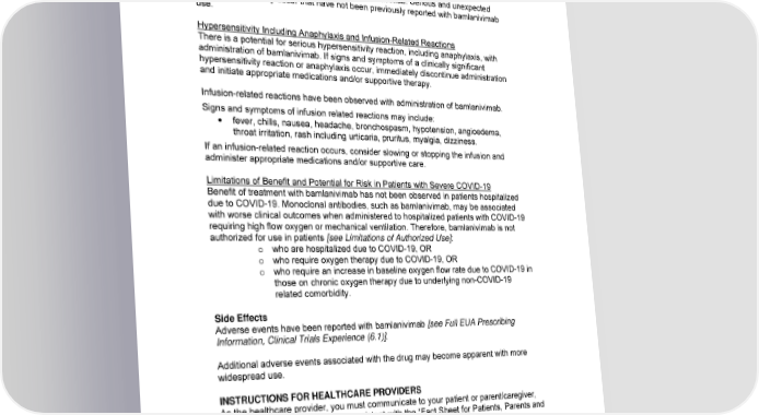 Storage Refrigerate unopened vials at 2°C to 8°C (36°F to 46°F) in the original carton to protect from light. Do not freeze, shake, or expose to direct light. Warnings There are limited clinical data available for bamlanivimab. Serious and unexpected adverse events may occur that have not been previously reported with bamlanivimab use. Hypersensitivity Including Anaphylaxis and Infusion-Related Reactions There is a potential for serious hypersensitivity reaction, including anaphylaxis, with administration of bamlanivimab. If signs and symptoms of a clinically significant hypersensitivity reaction or anaphylaxis occur, immediately discontinue administration and initiate appropriate medications and/or supportive therapy. Infusion-related reactions have been observed with administration of bamlanivimab. Signs and symptoms of infusion related reactions may include: fever, chills, nausea, headache, bronchospasm, hypotension, angioedema, throat irritation, rash including urticaria, pruritus, myalgia, dizziness. If an infusion-related reaction occurs, consider slowing or stopping the infusion and administer appropriate medications and/or supportive care. Limitations of Benefit and Potential for Risk in Patients with Severe COVID-19 Benefit of treatment with bamlanivimab has not been observed in patients hospitalized due to COVID-19. Monoclonal antibodies, such as bamlanivimab, may be associated with worse clinical outcomes when administered to hospitalized patients with COVID-19 requiring high flow oxygen or mechanical ventilation. Therefore, bamlanivimab is not authorized for use in patients [see Limitations of Authorized Use]: o who are hospitalized due to COVID-19, OR o who require oxygen therapy due to COVID-19, OR o who require an increase in baseline oxygen flow rate due to COVID-19 in those on chronic oxygen therapy due to underlying non-COVID-19 related comorbidity. Side Effects Adverse events have been reported with bamlanivimab [see Full EUA Prescribing Information, Clinical Trials Experience (6.1)]. Additional adverse events associated with the drug may become apparent with more widespread use. INSTRUCTIONS FOR HEALTHCARE PROVIDERS As the healthcare provider, you must communicate to your patient or parent/caregiver, as age appropriate, information consistent with the “Fact Sheet for Patients, Parents and Caregivers” (and provide a copy of the Fact Sheet) prior to the patient receiving bamlanivimab, including: FDA has authorized the emergency use of bamlanivimab for the treatment of mild to moderate COVID-19 in adults and pediatric patients with positive results of direct SARS-CoV-2 viral testing who are 12 years of age and older weighing at 5