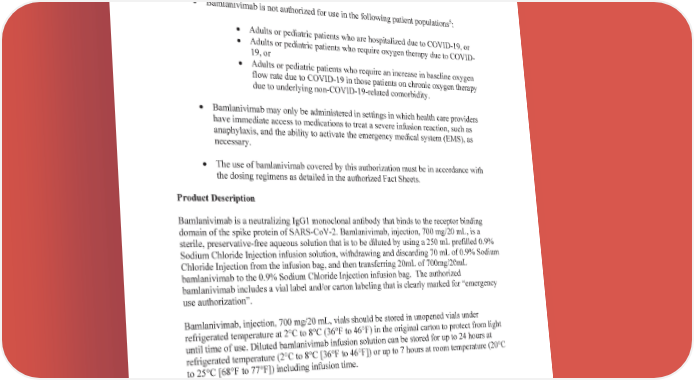 Page 3 – Eli Lilly and Company x The bamlanivimab covered by this authorization will be used only by healthcare providers to treat mild to moderate COVID-19 in adults and pediatric patients with positive results of direct SARS-CoV-2 viral testing who are 12 years of age and older weighing at least 40 kg, and who are at high risk for progressing to severe COVID-19 and/or hospitalization; x Bamlanivimab is not authorized for use in the following patient populations5: x Adults or pediatric patients who are hospitalized due to COVID-19, or x Adults or pediatric patients who require oxygen therapy due to COVID- 19, or x Adults or pediatric patients who require an increase in baseline oxygen flow rate due to COVID-19 in those patients on chronic oxygen therapy due to underlying non-COVID-19-related comorbidity. x Bamlanivimab may only be administered in settings in which health care providers have immediate access to medications to treat a severe infusion reaction, such as anaphylaxis, and the ability to activate the emergency medical system (EMS), as necessary. x The use of bamlanivimab covered by this authorization must be in accordance with the dosing regimens as detailed in the authorized Fact Sheets. Product Description Bamlanivimab is a neutralizing IgG1 monoclonal antibody that binds to the receptor binding domain of the spike protein of SARS-CoV-2. Bamlanivimab, injection, 700 mg/20 mL, is a sterile, preservative-free aqueous solution that is to be diluted by using a 250 mL prefilled 0.9% Sodium Chloride Injection infusion solution, withdrawing and discarding 70 mL of 0.9% Sodium Chloride Injection from the infusion bag, and then transferring 20mL of 700mg/20mL bamlanivimab to the 0.9% Sodium Chloride Injection infusion bag. The authorized bamlanivimab includes a vial label and/or carton labeling that is clearly marked for “emergency use authorization”. Bamlanivimab, injection, 700 mg/20 mL, vials should be stored in unopened vials under refrigerated temperature at 2°C to 8°C (36°F to 46°F) in the original carton to protect from light until time of use. Diluted bamlanivimab infusion solution can be stored for up to 24 hours at refrigerated temperature (2°C to 8°C [36°F to 46°F]) or up to 7 hours at room temperature (20°C to 25°C [68°F to 77°F]) including infusion time. 5 Benefit of treatment with bamlanivimab has not been observed in patients hospitalized due to COVID-19. Monoclonal antibodies, such as bamlanivimab, may be associated with worse clinical outcomes when administered to hospitalized patients with COVID-19 requiring high flow oxygen or mechanical ventilation. Reference ID: 4699500