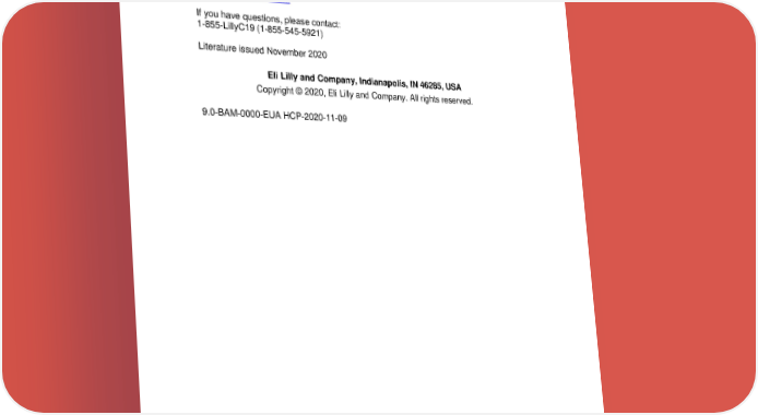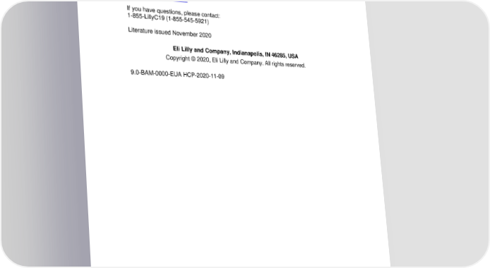 items, clean and disinfect “high touch” surfaces, and frequent handwashing) according to CDC guidelines. Also see Fact Sheet for Patients, Parents and Caregivers. 21 CONTACT INFORMATION For additional information visit: www.bamlanivimab.com If you have questions, please contact: 1-855-LillyC19 (1-855-545-5921) Literature issued November 2020 Eli Lilly and Company, Indianapolis, IN 46285, USA Copyright © 2020, Eli Lilly and Company. All rights reserved. 9.0-BAM-0000-EUA HCP-2020-11-09 23 Reference ID: 4699500