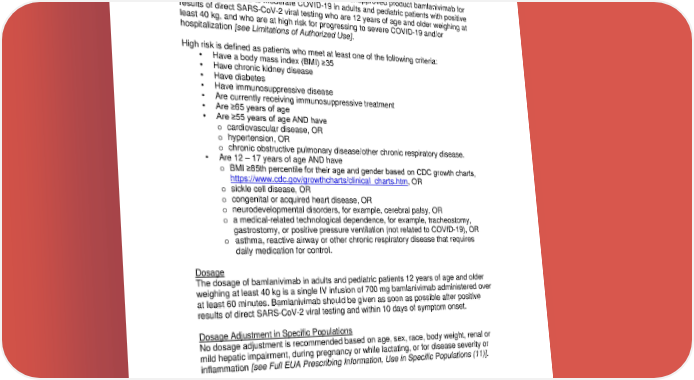 Contraindications None. Dosing Patient Selection and Treatment Initiation This section provides essential information on the unapproved product bamlanivimab for the treatment of mild to moderate COVID-19 in adults and pediatric patients with positive results of direct SARS-CoV-2 viral testing who are 12 years of age and older weighing at least 40 kg, and who are at high risk for progressing to severe COVID-19 and/or hospitalization [see Limitations of Authorized Use]. High risk is defined as patients who meet at least one of the following criteria: • Have a body mass index (BMI) ≥35 • Have chronic kidney disease • Have diabetes • Have immunosuppressive disease • Are currently receiving immunosuppressive treatment • Are ≥65 years of age • Are ≥55 years of age AND have o cardiovascular disease, OR o hypertension, OR o chronic obstructive pulmonary disease/other chronic respiratory disease. • Are 12 – 17 years of age AND have o BMI ≥85th percentile for their age and gender based on CDC growth charts, https://www.cdc.gov/growthcharts/clinical_charts.htm, OR o sickle cell disease, OR o congenital or acquired heart disease, OR o neurodevelopmental disorders, for example, cerebral palsy, OR o a medical-related technological dependence, for example, tracheostomy, gastrostomy, or positive pressure ventilation (not related to COVID-19), OR o asthma, reactive airway or other chronic respiratory disease that requires daily medication for control. Dosage The dosage of bamlanivimab in adults and pediatric patients 12 years of age and older weighing at least 40 kg is a single IV infusion of 700 mg bamlanivimab administered over at least 60 minutes. Bamlanivimab should be given as soon as possible after positive results of direct SARS-CoV-2 viral testing and within 10 days of symptom onset. Dosage Adjustment in Specific Populations No dosage adjustment is recommended based on age, sex, race, body weight, renal or mild hepatic impairment, during pregnancy or while lactating, or for disease severity or inflammation [see Full EUA Prescribing Information, Use in Specific Populations (11)]. Preparation and Administration Preparation Bamlanivimab solution for infusion should be prepared by a qualified healthcare professional using aseptic technique: • Remove the bamlanivimab vial from refrigerated storage and allow to equilibrate to room temperature for approximately 20 minutes before preparation. Do not expose to direct heat. 3 Reference ID: 4699500