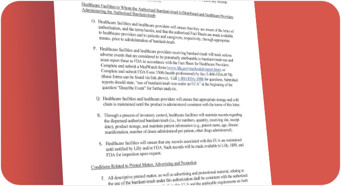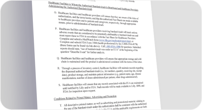 Page 7 – Eli Lilly and Company M. Through a process of inventory control, Lilly and authorized distributor(s) will maintain records regarding distribution of the authorized bamlanivimab (i.e., lot numbers, quantity, receiving site, receipt date). N. Lilly and authorized distributor(s) will make available to FDA upon request any records maintained in connection with this EUA. Healthcare Facilities to Whom the Authorized BamlanivimabIs Distributedand Healthcare Providers Administering the Authorized Bamlanivimab O. Healthcare facilities and healthcare providers will ensure that they are aware of the letter of authorization, and the terms herein, and that the authorized Fact Sheets are made available to healthcare providers and to patients and caregivers, respectively, through appropriate means, prior to administration of bamlanivimab. P. Healthcare facilities and healthcare providers receiving bamlanivimab will track serious adverse events that are considered to be potentially attributable to bamlanivimab use and must report these to FDA in accordance with the Fact Sheet for Healthcare Providers. Complete and submit a MedWatch form (www.fda.gov/medwatch/report.htm), or Complete and submit FDA Form 3500 (health professional) by fax (1-800-FDA-0178) (these forms can be found via link above). Call 1-800-FDA-1088 for questions. Submitted reports should state, “use of bamlanivimab was under an EUA” at the beginning of the question “Describe Event” for further analysis. Q. Healthcare facilities and healthcare providers will ensure that appropriate storage and cold chain is maintained until the product is administered consistent with the terms of this letter. R. Through a process of inventory control, healthcare facilities will maintain records regarding the dispensed authorized bamlanivimab (i.e., lot numbers, quantity, receiving site, receipt date), product storage, and maintain patient information (e.g., patient name, age, disease manifestation, number of doses administered per patient, other drugs administered). S. Healthcare facilities will ensure that any records associated with this EUA are maintained until notified by Lilly and/or FDA. Such records will be made available to Lilly, HHS, and FDA for inspection upon request. Conditions Related to Printed Matter, Advertising and Promotion T. All descriptive printed matter, as well as advertising and promotional material, relating to the use of the bamlanivimab under this authorization shall be consistent with the authorized labeling, as well as the terms set forth in this EUA and the applicable requirements set forth in the Act and FDA regulations. U. No descriptive printed matter, as well as advertising or promotional material, relating to the use of bamlanivimab may represent or suggest that such products are safe or effective when used for the treatment of mild to moderate COVID-19 in adults and pediatric patients with Reference ID: 4699500