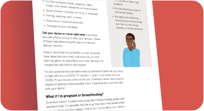 What are the side effects? Before you take bamlanivimab, tell Side effects can range from mild to serious and your doctor if you: 5 may include: • Have any allergies, diseases, • Wheezing (noisy breathing that may sound like or health conditions whistling) or trouble breathing • Are pregnant or plan to get • Swollen lips, face, or throat pregnant • Flu-like symptoms (fever, sweating, chills, • Are breastfeeding or plan to cough, sore throat, headache, or muscle pain) start breastfeeding • Upset stomach (nausea, vomiting, or diarrhea) • Are taking any medicines, • Itching, swelling, rash, or hives including prescription drugs, • Dizziness or low blood pressure over-the-counter drugs, • Changes in your heartbeat vitamins, or herbal products. Tell your doctor or nurse right away if you have any side effects during or after your infusion. Some of these side effects may be signs of a serious allergic reaction. Keep in mind that only a limited number of people have taken bamlanivimab, and scientists are still learning about its side effects and risks. Serious and unexpected side effects may happen. It’s also possible that bamlanivimab could make it harder for your body to fight off a future COVID-19 infection — and it could make a future COVID-19 vaccine less effective for you. Scientists haven’t done specific studies to address these possible risks. If you have any questions, talk with your doctor. What if I’m pregnant or breastfeeding? Scientists haven’t treated many pregnant or breastfeeding people with bamlanivimab. It’s possible that the drug may have more benefits than risks for them and their babies. Talk to your doctor about your options and your specific situation. 5 U.S. Food and Drug Administration: http://pi.lilly.com/eua/bamlanivimab-eua-fda-authorization-letter.pdf Page 3 | PP-BM-US-0009 November 2020 ©Lilly USA, LLC 2020. All rights reserved.