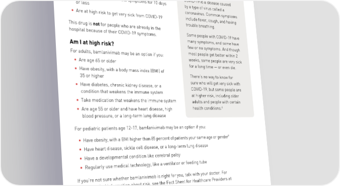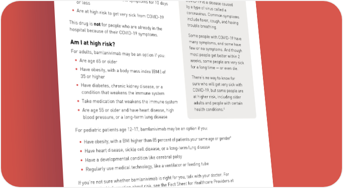 Who is this drug for? Bamlanivimab is a treatment option for people with 2 COVID-19 who: • Are age 12 or older What is COVID-19? • Weigh 88 pounds or more COVID-19 is a disease caused • Have had mild to moderate symptoms for 10 days by a type of virus called a or less coronavirus. Common symptoms • Are at high risk to get very sick from COVID-19 include fever, cough, and having trouble breathing. This drug is not for people who are already in the hospital because of their COVID-19 symptoms. Some people with COVID-19 have many symptoms, and some have Am I at high risk? few or no symptoms. And though For adults, bamlanivimab may be an option if you: most people get better within 2 weeks, some people are very sick • Are age 65 or older for a long time — or even die. • Have obesity, with a body mass index (BMI) of 35 or higher There’s no way to know for • Have diabetes, chronic kidney disease, or a sure who will get very sick with condition that weakens the immune system COVID-19, but some people are at higher risk, including older • Take medication that weakens the immune system adults and people with certain 4 • Are age 55 or older and have heart disease, high health conditions. blood pressure, or a long-term lung disease For pediatric patients age 12-17, bamlanivimab may be an option if you: 9 • Have obesity, with a BMI higher than 85 percent of patients your same age or gender • Have heart disease, sickle cell disease, or a long-term lung disease • Have a developmental condition like cerebral palsy • Regularly use medical technology, like a ventilator or feeding tube If you’re not sure whether bamlanivimab is right for you, talk with your doctor. For more detailed information about risk, see the Fact Sheet for Healthcare Providers at bamlanivimab.com. 2 U.S. Food and Drug Administration: http://pi.lilly.com/eua/bamlanivimab-eua-fda-authorization- letter.pdf 3 U.S. Centers for Disease Control and Prevention: https://www.cdc.gov/healthyweight/bmi/calculator.html 4 U.S. Centers for Disease Control and Prevention: cdc.gov/coronavirus/2019-ncov/symptoms-testing/symptoms Page 2 | PP-BM-US-0009 November 2020 ©Lilly USA, LLC 2020. All rights reserved.