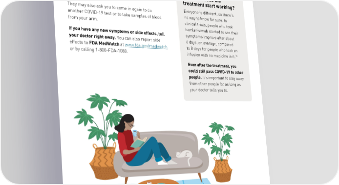 What happens after my appointment? In the days and weeks after your infusion, your doctor or the clinic staff will keep checking with you to see how you feel and which COVID-19 symptoms How soon does the you have. treatment start working? They may also ask you to come in again to do Everyone is different, so there’s another COVID-19 test or to take samples of blood no way to know for sure. In from your arm. clinical trials, people who took bamlanivimab started to see their If you have any new symptoms or side effects, tell symptoms improve after about your doctor right away. You can also report side 6 days, on average, compared effects to FDA MedWatch at www.fda.gov/medwatch to 8 days for people who took an or by calling 1-800-FDA-1088. 16 infusion with no medicine in it. Even after the treatment, you could still pass COVID-19 to other people. It’s important to stay away from other people for as long as your doctor tells you to. 16 Eli Lilly and Company: http://pi.lilly.com/eua/bamlanivimab-eua-factsheet-hcp.pdf Page 8 | PP-BM-US-0009 November 2020 ©Lilly USA, LLC 2020. All rights reserved.