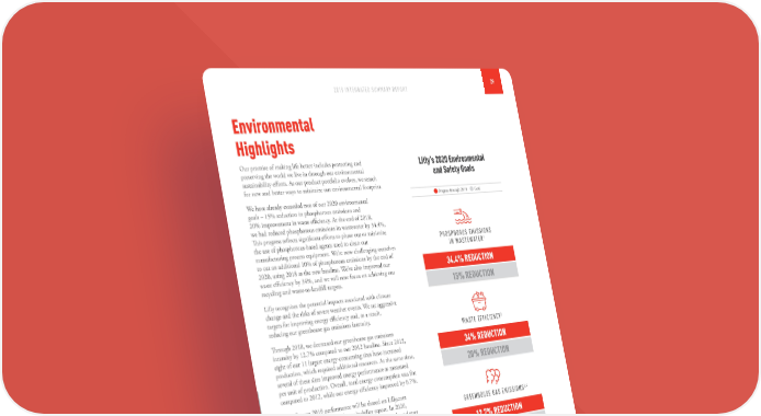 29 2019 INTEGRATED SUMMARY REPORT Environmental Highlights Our promise of making life better includes protecting and Lilly’s 2020 Environmental preserving the world we live in through our environmental and Safety Goals sustainability efforts. As our product portfolio evolves, we search for new and better ways to minimize our environmental footprint. We have already exceeded two of our 2020 environmental Progress through 2018 Goal goals – 15% reduction in phosphorous emissions and 20% improvement in waste efficiency. At the end of 2018, we had reduced phosphorous emissions in wastewater by 34.4%. This progress reflects significant efforts to phase out or minimize PHOSPHORUS EMISSIONS the use of phosphorous-based agents used to clean our 1 manufacturing process equipment. We’re now challenging ourselves IN WASTEWATER to cut an additional 10% of phosphorous emissions by the end of 2020, using 2018 as the new baseline. We’ve also improved our 34.4% REDUCTION waste efficiency by 34%, and we will now focus on achieving our recycling and waste-to-landfill targets. 15% REDUCTION Lilly recognizes the potential impacts associated with climate change and the risks of severe weather events. We set aggressive targets for improving energy efficiency and, as a result, reducing our greenhouse gas emissions intensity. 2 Through 2018, we decreased our greenhouse gas emissions WASTE EFFICIENCY intensity by 12.7% compared to our 2012 baseline. Since 2012, 34% REDUCTION eight of our 11 largest energy-consuming sites have increased production, which required additional resources. At the same time, 20% REDUCTION several of these sites improved energy performance as measured per unit of production. Overall, total energy consumption was flat compared to 2012, while our energy efficiency improved by 0.7%. Data for our 2019 performance will be shared on Lilly.com in mid-2020 in our detailed sustainability report. In 2020, 3,4 we will establish our next wave of environmental goals and start GREENHOUSE GAS EMISSIONS tracking our progress toward them. 12.7% REDUCTION In 2019, Lilly scored a rating of B on climate change and B on water from CDP. CDP is the world’s largest repository of 20% REDUCTION environmental management information. It allows companies and their stakeholders to assess environmental performance. 5 ENERGY EFFICIENCY 0.7% REDUCTION 20% REDUCTION 1. Following World Resources Institute guidance, progress toward environmental goals is reported on an adjusted basis accounting for mergers, acquisitions and divestitures, as appropriate, to ensure comparability, unless stated otherwise. 2. Per square foot of site space. 3. This goal covers Lilly’s Scope 1 and Scope 2 emissions related to site-purchased energy (e.g., electricity, steam, chilled water) and on-site fuel combustion. 4. Per unit of production or site-relevant index. Lilly’s waste goals do not include materials that are deemed “beneficially reused” without extensive processing. Examples include coal ash reused for mine reclamation or road base, and mycelia and urea reused for fertilizer. 5. In absolute terms.