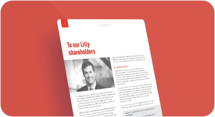 2 ELI LILLY AND COMPANY To our Lilly shareholders exposure, upcoming data readouts for key growth drivers, and additional potential approvals and productivity improvements in the works, it is an exciting time for Lilly and the people we serve. DELIVERING RESULTS Thanks to the work of our more than 33,000 employees, Lilly’s revenue grew 4% to $22.3 billion in 2019, driven by volume. Despite the lingering impact of the loss of exclusivity for Cialis, sales volume rose 8% while net selling price declined 3%. Our key growth products, including Trulicity, Taltz, Verzenio, Jardiance and Emgality, continued to drive impressive worldwide volume growth. During the past year, we’ve made strides toward leadership in each I am pleased to report that 2019 was a strong year for Eli Lilly of our therapeutic research areas: diabetes, oncology, immunology, and Company. We delivered solid financial results, developed and pain and neurodegeneration. We continued our unprecedented launched important new medicines, and made progress on our pace of launching new medicines and improved manufacturing productivity agenda. The most meaningful metric for Lilly – productivity. We’re on track to meet our goal of 31% non-GAAP the number of people our medicines are helping – totaled more operating margin by the end of 2020, even as we increase than 40 million in the past year alone. investments in R&D. While this figure is remarkable, the ease with which people can To this end, we are focused on strengthening the efficiency of our access innovative medicines varies widely around the world. R&D engine. 2019 produced significant advancements, as we: In the U.S., broad access to the latest treatments can be constrained by complicated or narrow insurance benefits that • received U.S. approval for two new medicines, Reyvow reduce affordability. In other advanced economies, countries and Baqsimi; sometimes ration new treatments to fund the obligations of government-run health programs. And in developing countries, • obtained new indication approvals for Trulicity, Taltz, nascent health systems struggle to allocate limited resources Emgality and Cyramza; between care for acute and chronic diseases. • added four new Phase 3 clinical programs to our pipeline, These issues are complex, but we have solved difficult challenges all with potential to be first-in-class or best-in-class; before. As a company that has been in business for 144 years and invests more than $5 billion annually in research and development • reported 12 positive Phase 3 or registrational trial read- (R&D), we are in this for the long haul. We understand the outs, including a mix of new molecular entities (NMEs), importance of adapting, evolving and improving while remaining new indications or data for launched products; and firmly grounded in our core values: integrity, excellence and respect • submitted 12 NMEs or new indications for regulatory for people. With these standards as our guide, we will continue to review in geographies around the world. find effective ways to partner within and across health systems with the aim of facilitating patient access to the latest treatments, regardless of income level or geography. In 2019, Lilly invested more than $13 billion to drive our We have made progress, but we know there is still much to do. future growth through a combination of business development, As we transition to a new decade, our pipeline and commercial capital expenditures and after-tax investment in R&D. successes will serve as a springboard for sustained growth and We returned approximately $7 billion to shareholders via productivity. With strong new product growth and limited patent dividends and share repurchases and announced a 15%
