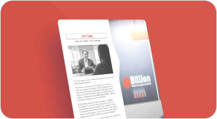 10 ELI LILLY AND COMPANY JEFF YANG GLOBAL DEVELOPMENT LEADER, MIGRAINE For Lilly’s migraine team, pushing the boundaries of science started with asking bold questions. “We listened to patients and external advisors to learn how we could reset treatment expectations. Could we push ourselves to demonstrate the medicine can help patients be migraine free?” said Jyun-Yan (Jeff) Yang, M.D., global development leader for migraine. “It allowed us to design the Phase 3 studies to raise the bar on what a migraine treatment could deliver.” In 2019, that preventative migraine treatment – Emgality – became the U.S. leader in new-to-brand prescriptions and received FDA approval for episodic cluster headache. In 2020, Lilly launched a second new medicine, Reyvow, to stop migraine attacks when they happen – the first new class of acute migraine treatment approved by the FDA in more than two decades. “These new medicines are bringing new optimism for people living with migraine,” Dr. Yang said. Merle Diamond, M.D., president and managing director of the Diamond Headache Clinic in Chicago, said new classes of medication have made life better for her patients. “Having these medications has changed my 30-year practice of headache,” said Dr. Diamond. “These are the first doors that we have been able to walk through to help our patients achieve a life without disability.”