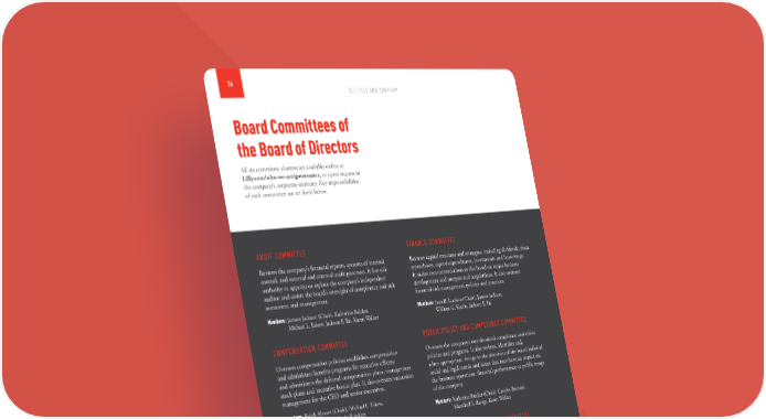 36 ELI LILLY AND COMPANY Board Committees of the Board of Directors All six committee charters are available online at Lilly.com/who-we-are/governance, or upon request to the company’s corporate secretary. Key responsibilities of each committee are set forth below. AUDIT COMMITTEE FINANCE COMMITTEE Reviews the company’s financial reports, systems of internal Reviews capital structure and strategies, including dividends, share control, and internal and external audit processes. It has sole repurchases, capital expenditures, investments and borrowings. authority to appoint or replace the company’s independent It makes recommendations to the board on major business auditor and assists the board’s oversight of compliance and risk development and mergers and acquisitions. It also oversees assessment and management. financial risk management policies and practices. Members: Jamere Jackson (Chair), Katherine Baicker, Members: Juan R. Luciano (Chair), Jamere Jackson, Michael L. Eskew, Jackson P. Tai, Karen Walker William G. Kaelin, Jackson P. Tai COMPENSATION COMMITTEE PUBLIC POLICY AND COMPLIANCE COMMITTEE Oversees compensation policies; establishes compensation Oversees the company’s non-financial compliance and ethics and administers benefits programs for executive officers; policies and programs. It also reviews, identifies and, and administers the deferred compensation plans, management when appropriate, brings to the attention of the board political, stock plans and incentive bonus plan. It also oversees succession social and legal trends and issues that may have an impact on management for the CEO and senior executives. the business operations, financial performance or public image Members: Ralph Alvarez (Chair), Michael L. Eskew, of the company. J. Erik Fyrwald, Kathi P. Seifert Members: Katherine Baicker (Chair), Carolyn Bertozzi, Marschall S. Runge, Karen Walker DIRECTORS AND CORPORATE GOVERNANCE COMMITTEE SCIENCE AND TECHNOLOGY COMMITTEE Identifies and recommends to the board candidates for Reviews and makes recommendations regarding the company’s membership on the board and board committees and oversees strategic research goals and objectives and pipeline of potential matters of corporate governance, director independence, new medicines. It also reviews new developments, technologies and director compensation and board performance. trends in pharmaceutical research and development and oversees Members: Michael L. Eskew (Chair), Juan R. Luciano, matters of scientific and medical integrity and risk management. Kathi P. Seifert, Jackson P. Tai Members: William G. Kaelin (Chair), Ralph Alvarez, Carolyn Bertozzi, J. Erik Fyrwald, Marschall S. Runge For more information on the Board of Directors, please see the 2020 Proxy Statement.