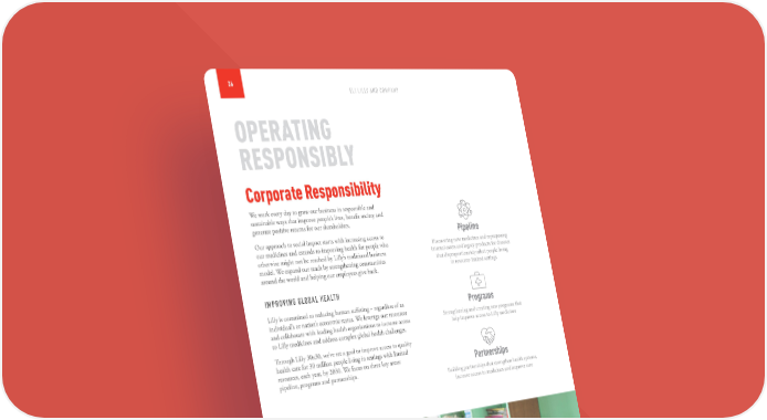 26 ELI LILLY AND COMPANY OPERATING RESPONSIBLY Corporate Responsibility We work every day to grow our business in responsible and sustainable ways that improve people’s lives, benefit society and generate positive returns for our shareholders. Pipeline Our approach to social impact starts with increasing access to our medicines and extends to improving health for people who Discovering new medicines and repurposing otherwise might not be reached by Lilly’s traditional business internal assets and legacy products for diseases model. We expand our reach by strengthening communities that disproportionately affect people living around the world and helping our employees give back. in resource-limited settings IMPROVING GLOBAL HEALTH Lilly is committed to reducing human suffering – regardless of an Programs individual’s or nation’s economic status. We leverage our resources Strengthening and creating new programs that and collaborate with leading health organizations to increase access help improve access to Lilly medicines to Lilly medicines and address complex global health challenges. Through Lilly 30x30, we’ve set a goal to improve access to quality health care for 30 million people living in settings with limited resources, each year, by 2030. We focus on three key areas: Partnerships pipeline, programs and partnerships. Building partnerships that strengthen health systems, increase access to medicines and improve care TERESA HOGAN CASE MANAGEMENT Connecting Hearts Abroad Program, Panama