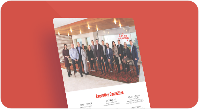37 2019 INTEGRATED SUMMARY REPORT Executive Committee JOHNA L. NORTON STEPHEN F. FRY MELISSA S. BARNES Senior Vice President, Senior Vice President, Senior Vice President, Global Quality Human Resources and Diversity Enterprise Risk Management and Chief Ethics and Compliance Officer MICHAEL B. MASON DAVID A. RICKS Senior Vice President and President, Chairman and Chief Executive Officer ALFONSO ZULUETA Lilly Diabetes Senior Vice President and President, JOSHUA L. SMILEY Lilly International MYLES O’NEILL Senior Vice President and Senior Vice President and President, Chief Financial Officer ANNE E. WHITE Manufacturing Operations Senior Vice President and President, DANIEL M. SKOVRONSKY, Lilly Oncology AARTI SHAH, PH.D. M.D. PH.D. Senior Vice President and Senior Vice President and PATRIK JONSSON Chief Information and Digital Officer Chief Scientific Officer, and President, Senior Vice President and President, Lilly Research Laboratories Lilly Bio-Medicines LEIGH ANN PUSEY Senior Vice President, Not Pictured Corporate Affairs and Communications ANAT HAKIM Senior Vice President and General Counsel