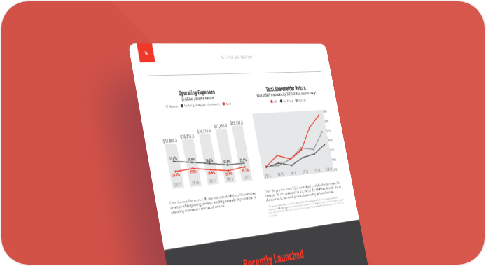 14 ELI LILLY AND COMPANY Operating Expenses Total Shareholder Return ($ millions, percent of revenue) Value of $100 Invested in Lilly, S&P 500 Stock and Peer Group* Revenue Marketing, Selling and Administrative R&D Lilly Peer Group S&P 500 $225 $21,493.3 $22,319.5 $19,973.8 $200 $17,050.5 $18,312.8 $175 $150 33.6% 31.9% 30.0% 27.8% 27.8% $125 26.5% 27.5% 25.5% 25.1% $100 23.5% 2015 2016 2017 2018 2019 2014 2015 2016 2017 2018 2019 $75 Over the past five years, Lilly has maintained relatively flat operating Over the past five years, Lilly’s annualized total shareholder return has expenses while growing revenue, resulting in steady improvement in averaged 16.7%, compared to 11.7% for the S&P benchmark, due to operating expense as a percent of revenue. the increase in the stock price and increasing dividend stream. * The graph measures total shareholder return, which takes into account both stock price and dividends. It assumes that dividends paid by a company are reinvested in that company’s stock. See Item 5 of the company’s latest Form 10-K filed with the U.S. Securities and Exchange Commission for those companies included in our peer group. Recently Launched Products Baqsimi is the first and only dry nasal spray to treat low Reyvow is the first new class of acute treatment for blood sugar emergencies. This is a significant improvement migraine approved in more than two decades. in user experience, exemplifies the type of innovation we Reyvow has shown the ability to provide fast and complete strive to deliver to patients and has the potential to grow pain freedom and allow adult patients to get back to the overall glucagon market. their lives. Together with Emgality, we now offer treatments for both acute and preventive care of migraine.
