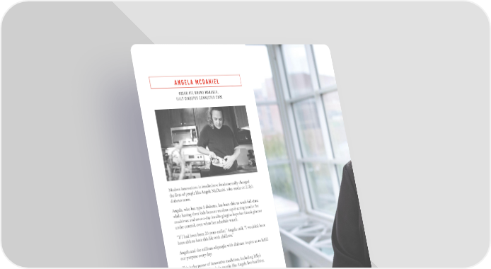 16 ELI LILLY AND COMPANY ANGELA MCDANIEL ASSOCIATE BRAND MANAGER, LILLY DIABETES CONNECTED CARE Modern innovations in insulin have fundamentally changed the lives of people like Angela McDaniel, who works on Lilly’s diabetes team. Angela, who has type 1 diabetes, has been able to work full-time while having three kids because modern rapid-acting insulin for mealtimes and once-a-day insulin glargine kept her blood glucose under control, even when her schedule wasn’t. “If I had been born 20 years earlier,” Angela said, “I wouldn’t have been able to have this life with children.” Angela and the millions of people with diabetes inspire us to fulfill our purpose every day. This is the power of innovative medicines, including Lilly’s modern insulins. They help people like Angela live healthier, more productive lives.