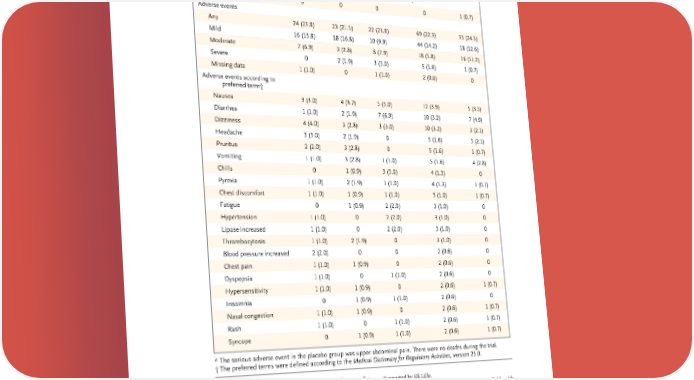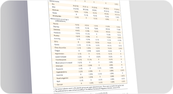The new england journal of medicine Table 4. Adverse Events. LY-CoV555 Placebo Adverse Events (N = 309) (N = 143) 700 mg 2800 mg 7000 mg Pooled Doses (N = 101) (N = 107) (N = 101) (N = 309) number of patients (percent) Serious adverse events* 0 0 0 0 1 (0.7) Adverse events Any 24 (23.8) 23 (21.5) 22 (21.8) 69 (22.3) 35 (24.5) Mild 16 (15.8) 18 (16.8) 10 (9.9) 44 (14.2) 18 (12.6) Moderate 7 (6.9) 3 (2.8) 8 (7.9) 18 (5.8) 16 (11.2) Severe 0 2 (1.9) 3 (3.0) 5 (1.6) 1 (0.7) Missing data 1 (1.0) 0 1 (1.0) 2 (0.6) 0 Adverse events according to preferred term† Nausea 3 (3.0) 4 (3.7) 5 (5.0) 12 (3.9) 5 (3.5) Diarrhea 1 (1.0) 2 (1.9) 7 (6.9) 10 (3.2) 7 (4.9) Dizziness 4 (4.0) 3 (2.8) 3 (3.0) 10 (3.2) 3 (2.1) Headache 3 (3.0) 2 (1.9) 0 5 (1.6) 3 (2.1) Pruritus 2 (2.0) 3 (2.8) 0 5 (1.6) 1 (0.7) Vomiting 1 (1.0) 3 (2.8) 1 (1.0) 5 (1.6) 4 (2.8) Chills 0 1 (0.9) 3 (3.0) 4 (1.3) 0 Pyrexia 1 (1.0) 2 (1.9) 1 (1.0) 4 (1.3) 1 (0.7) Chest discomfort 1 (1.0) 1 (0.9) 1 (1.0) 3 (1.0) 1 (0.7) Fatigue 0 1 (0.9) 2 (2.0) 3 (1.0) 0 Hypertension 1 (1.0) 0 2 (2.0) 3 (1.0) 0 Lipase increased 1 (1.0) 0 2 (2.0) 3 (1.0) 0 Thrombocytosis 1 (1.0) 2 (1.9) 0 3 (1.0) 0 Blood pressure increased 2 (2.0) 0 0 2 (0.6) 0 Chest pain 1 (1.0) 1 (0.9) 0 2 (0.6) 0 Dyspepsia 1 (1.0) 0 1 (1.0) 2 (0.6) 0 Hypersensitivity 1 (1.0) 1 (0.9) 0 2 (0.6) 1 (0.7) Insomnia 0 1 (0.9) 1 (1.0) 2 (0.6) 0 Nasal congestion 1 (1.0) 1 (0.9) 0 2 (0.6) 1 (0.7) Rash 1 (1.0) 0 1 (1.0) 2 (0.6) 1 (0.7) Syncope 0 1 (0.9) 1 (1.0) 2 (0.6) 1 (0.7) * The serious adverse event in the placebo group was upper abdominal pain. There were no deaths during the trial. † The preferred terms were defined according to the Medical Dictionary for Regulatory Activities, version 23.0. and a lower symptom burden than those who Supported by Eli Lilly. received placebo, with the most pronounced ef- Disclosure forms provided by the authors are available with fects observed in high-risk cohorts. If these re- the full text of this article at NEJM.org. sults are confirmed in additional analyses in this A data sharing statement provided by the authors is available with the full text of this article at NEJM.org. trial, LY-CoV555 could become a useful treatment We thank Adam Clooney, Ph.D., of Eli Lilly, for providing med- for emergency use in patients with recently diag- ical-writing and other editorial support with an earlier version nosed Covid-19. of the manuscript. 8 n engl j med nejm.org The New England Journal of Medicine Downloaded from nejm.org on November 19, 2020. For personal use only. No other uses without permission. Copyright © 2020 Massachusetts Medical Society. All rights reserved.