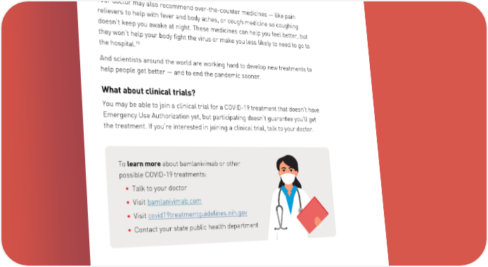 What other treatment options are there for COVID-19? Bamlanivimab is among the first drugs given Emergency Use Authorization to treat people with COVID-19 who are newly diagnosed and have mild to 14 moderate symptoms. Your doctor may also recommend over-the-counter medicines — like pain relievers to help with fever and body aches, or cough medicine so coughing doesn’t keep you awake at night. These medicines can help you feel better, but they won’t help your body fight the virus or make you less likely to need to go to 15 the hospital. And scientists around the world are working hard to develop new treatments to help people get better — and to end the pandemic sooner. What about clinical trials? You may be able to join a clinical trial for a COVID-19 treatment that doesn’t have Emergency Use Authorization yet, but participating doesn’t guarantee you’ll get the treatment. If you’re interested in joining a clinical trial, talk to your doctor. To learn more about bamlanivimab or other possible COVID-19 treatments: • Talk to your doctor • Visit bamlanivimab.com • Visit covid19treatmentguidelines.nih.gov • Contact your state public health department 14 U.S. Food and Drug Administration: http://pi.lilly.com/eua/bamlanivimab-eua-fda-authorization-letter.pdf 15 U.S. Centers for Disease Control and Prevention: https://www.cdc.gov/coronavirus/2019-ncov/if-you-are-sick/steps-when-sick.html Page 7 | PP-BM-US-0012 November 2020 ©Lilly USA, LLC 2020. All rights reserved.