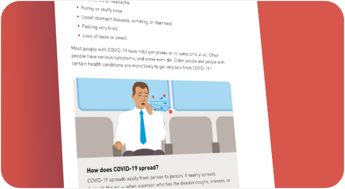 What is COVID-19? COVID-19 is a disease caused by a virus called SARS-CoV-2. This is a type 2 of coronavirus. COVID-19 can cause: • Fever or chills • Cough, sore throat, or trouble breathing • Body aches or headache • Runny or stuffy nose • Upset stomach (nausea, vomiting, or diarrhea) • Feeling very tired • Loss of taste or smell Most people with COVID-19 have mild symptoms or no symptoms at all. Other people have serious symptoms, and some even die. Older people and people with 3 certain health conditions are more likely to get very sick from COVID-19. How does COVID-19 spread? COVID-19 spreads easily from person to person. It mainly spreads through the air — when a person who has the disease coughs, sneezes, or 4 talks and someone nearby breathes in their germs. 2 U.S. Centers for Disease Control and Prevention: https://www.cdc.gov/coronavirus/2019-ncov/symptoms-testing/symptoms.html 3 U.S. Centers for Disease Control and Prevention: https://www.cdc.gov/coronavirus/2019-ncov/symptoms-testing/symptoms.html 4 U.S. Centers for Disease Control and Prevention: https://www.cdc.gov/coronavirus/2019-ncov/prevent-getting-sick/how-covid-spreads.html Page 2 | PP-BM-US-0012 November 2020 ©Lilly USA, LLC 2020. All rights reserved.